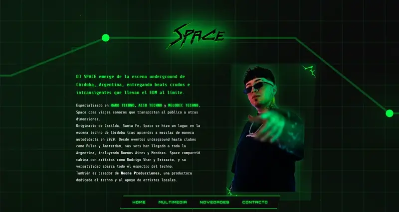 spacedj.com.arHub profesional que integra biografía artística, press kit, galería multimedia y sección de novedades conectada con Instagram. Rider técnico, fotos y videos en un sitio cyberpunk animado, único dentro de la escena techno underground. Promoción de eventos, fiestas, DJ sets y más en Redes Sociales y listas de mailing. Diseño para Redes Sociales.